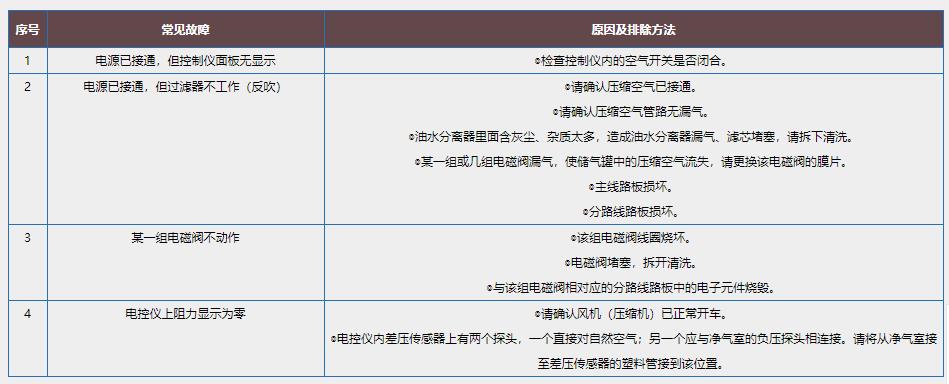 自潔式空氣過(guò)濾器常見(jiàn)故障的原因及排除方法: