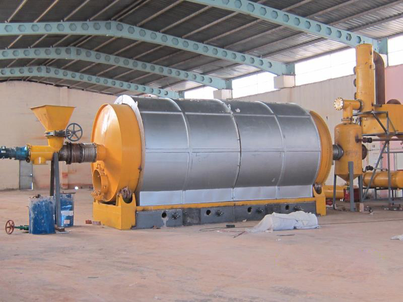 廢舊輪胎裂解煉油設(shè)備將廢輪胎破碎成裂解所需的橡膠塊,與低溫硫轉(zhuǎn)移催化劑一起通過(guò)進(jìn)料機(jī)經(jīng)熱氣密裝置連續(xù)送入裂解器,進(jìn)行常壓低溫裂解裂化反應(yīng)。